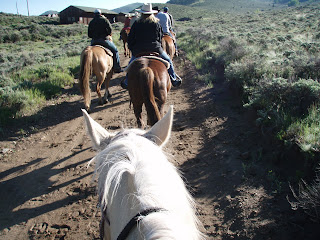 While the dude and I partied with Uncle Kyle, Dadio was playing on a dude ranch. His company owns an unbelievably beautiful and oh so cool ranch out in Wyoming-about 5 hours from us. They were opening for the season and Tim is now in charge of managing all things financial for the ranch. SO....he got the "task" of driving out and spending 5 days with the staff, the horses and the endless amounts of mud that resulted from 3 days of consistent rain. Bummer. He did get to take a lovely horse ride, minus his lovely wife, to a meadow where breakfast was served. I still can't get a mental image of my husband on a horse in a meadow, but he swears it did indeed happen. He hiked a bit, ate quite well and slept in peace and utter silence (the part I was most jealous about). The diesel trucks on each side of our house and a three year old needing to use the facilities in the middle of the night don't provide much in the area of utter silence.