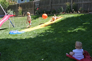 We've been looking to "upgrade" our swingset for quite some time. Ya know, getting rid of the one that elevates 4 feet off the ground every time Dude swings on it, causing him to fly off the swing in a nervous giggle each and every time. Well, we found one on Craigslist for under $200, which is a real steal in the world of used swingsets. What we didn't realize is how much "Daddy" time it would require before it was swingable. My dear hubbie did a fantastic job cutting, measuring, bolting and tightening and now our kiddos are having the time of their lives on our brand newish swingset. It comes fully loaded with 4 swings, a turbo slide, a fort, fireman pole and soon to be climbing wall.